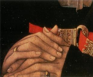 | Keywords: Rogier van der weyden, ritratto di donna, washington, dettaglio mani.jpg  Artwork Creator Rogier van der Weyden Crop of Portrait of a Lady Washington showing the sitter's tightly crossed fingers and red belt ca 1460 Oil oak panel size cm 37 27 Institution National Gallery of Art http //www nga gov/content/ngaweb/Collection/art-object-page 51 html National Gallery of Art WGA link 25706 http //www wga hu/art/w/weyden/rogier/16portra/05lady jpg http //www wga hu/html/w/weyden/rogier/16portra/05lady html object history credit line accession number Francesca Salvadori Washington National Gallery of Art Electa Milano 2005 PD-old-100 <gallery> File Rogier van der Weyden - Portrait of a Lady - Google Art Project jpg High Resolution Google Art Project File Rogier van der Weyden 027 jpg high res but little detail File Rogier van der Weyden Portrait of A lady C1460 jpg low res lighter background </gallery> Portrait of a Lady by Rogier van der Weyden Washington Details of paintings by Rogier van der Weyden Portrait of a Lady Washington detail3 |
