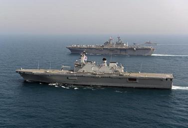 Keywords: ROKS Dokdo (LPH 6111) and USS Bonhomme Richard (LHD-6) underway in March 2014.JPG en The Republic of Korea amphibious assault ship ROKS Dokdo LPH 6111 assigned to Commander Flotilla COMFLOT 5 transits alongside the U S Navy amphibious assault ship USS Bonhomme Richard LHD-6 and other ships from COMFLOT-5 and the Bonhomme Richard Amphibious Ready Group during a photo exercise as part of Exercise Ssang Yong The annual combined exercise is conducted by Navy and Marine forces with the Republic of Korea in order to strengthen interoperability across the range of military operations 2014-03-27 140327-N-BJ178-476 Navy http //www navy mil/view_image asp id 173956 U S Navy photo by Mass Communication Specialist 2nd Class Michael Achterling PD-USGov-Military-Navy ROKS Dokdo LPH 6111 General views of USS Bonhomme Richard LHD-6