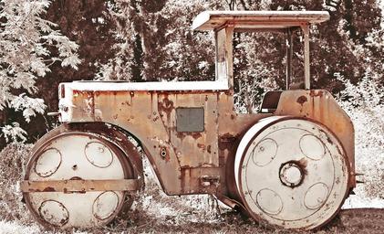 Keywords: roll construction machine road roller old rots decay broken weathered retired lapsed obsolete turned off discarded wreck rotted roll disused roller shut down ailing stainless rusted metal rusty iron bare