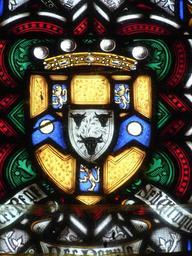 | Keywords: RolleArmsWithWalrondInescutcheonBictonChurch.JPG Stained glass armorial Baron Rolle memorial window north transept Bicton Church built 1850 The arms are Rolle with an inescutcheon of pretence of Walrond Argent a chevron between three bull's heads affronte sable This marshalling indicates that Judith Walrond was the sole heiress of her father and that the Walrond lands had descended to Rolle own photo stained glass 1850; photo March 2012 unknown artist John Rolle 1st Baron Rolle Rolle arm Walrond arms |