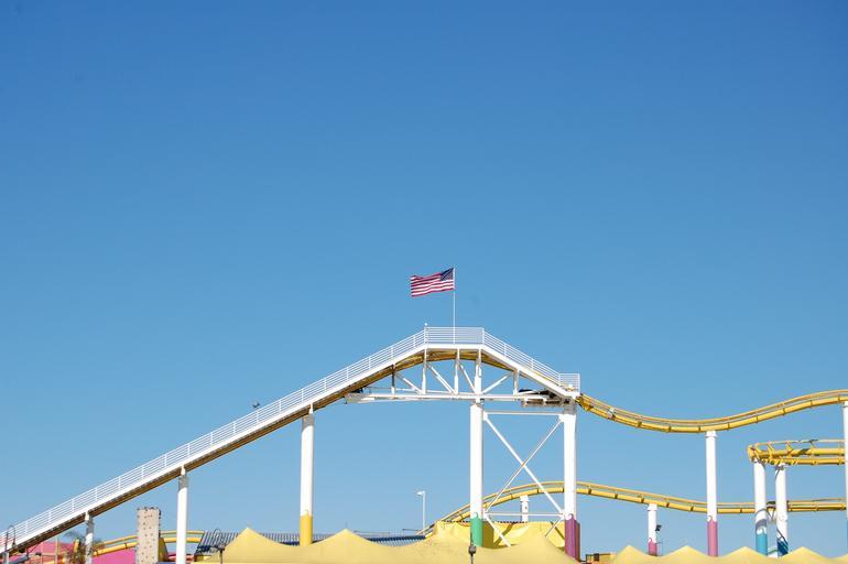 Keywords: rollercoaster flag usa sky blue cloudless bright amusement park coaster fair summer entertainment