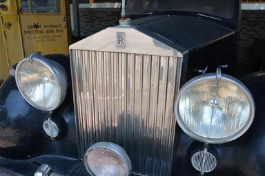 Keywords: rolls royce silver wraith touring limousine car emblem lights style badge automotive luxury motor vehicle elegant transport logo showroom metal headlamp headlight bumper limousine retro old vintage classic antique chrome front nostalgia transportation british shiny hood aged black