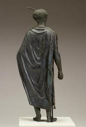 | Keywords: Roman - Mercury - Walters 54605 - Back.jpg The wings one missing on the head of this figure identify it as representing Mercury the messenger of the gods It is exquisitely detailed and larger than most statuettes made for household worship suggesting that it was prominently displayed within the villa of a wealthy Roman family The hairstyle dates the piece to the mid 1st century when artists were still very much influenced by the Classical style of Greek art His left hand would have held the caduceus or herald's staff that is his attribute familiar today as a medical symbol AD 40-80 Julio-Claudian ; Flavian cast bronze with silver coat and inlay cm 29 2 11 8 5 6 accession number 54 605 25406 Henry Walters Baltimore date and mode of acquisition unknown Walters Art Museum Henry Walters Acquired by Henry Walters The Gods Delight The Human Figure in Classical Bronze The Cleveland Museum of Art Cleveland 1988-1989 place of origin Roman Empire Walters Art Museum license Ancient Roman sculptures in the Walters Art Museum Ancient Roman bronze statuettes of Mercurius Media contributed by the Walters Art Museum needs category review |