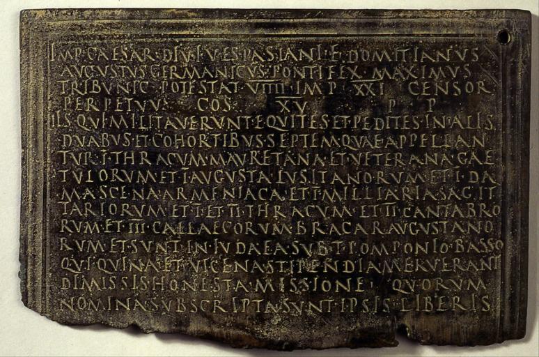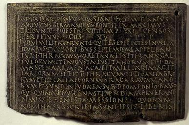 | Keywords: Roman Military Diploma - Google Art Project.jpg commons date commons medium commons dimensions commons institution Institution Israel Museum commons location commons references commons object_history commons exhibition_history commons credit_line commons inscriptions commons notes commons accession_number commons source commons permission commons other_versions commons zoom core title Roman Military Diploma core creator Unknown core date dateCreated 0090 core location Provenance unknown core type Diploma core rights Photo © Israel Museum Jerusalem by Peter Lanyi core relation http //www imj org il/imagine/galleries/archaeologyE asp core format medium Bronze c-04fe5146 customtext curator Mevorah David c-04fe5146 customtext dimensions H 10 7; W 16 c-04fe5146 customtext medium_extent Complete c-04fe5146 customtext dimensions_extent Complete c-04fe5146 customtext curator_extent Complete google display_date 0090 google is_artproject TRUE google is_gigapixel FALSE google is_secured TRUE google street_view_asset/id iQEu5-RzOm82-A google street_view_level/id 11503288195731669917 google street_view_location 31 772649765014648 35 204139709472656 0 92000001668930054 -BGm7etbwelh1bgQeVfvwg google partner/id 0000000004fe5146 google picasa_token Kr-y4BLANgBxRt-_kZG3s_yzE9A special url_id 3gFq0ZxSovlU0w google partner/name The Israel Museum Jerusalem special partner/name_no_lang The Israel Museum Jerusalem PD-old-100-1923 Google Art Project works by unknown artist Roman military diploma Second Temple period in Israel Museum Cohors II Cantabrorum Cantabrorum Ancient Roman inscriptions in Israel Ancient Roman bronzes in Israel |