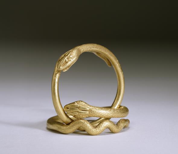 | Keywords: Roman - Pair of Snake Bracelets - Walters 57528, 57529 - Group.jpg  In the ancient Greek and Roman world snakes symbolized fertility and were believed to ward off evil It is probably due to the animal's protective associations that solid gold snake rings and bracelets were among the most popular types of Greek and Roman jewelry Snake bracelets were often worn in pairs around the wrists as well as on the upper arms century 1 AD gold cm 8 2 accession number 57 528 57 529 77931 Henry Walters Baltimore date and mode of acquisition unknown Walters Art Museum Henry Walters Acquired by Henry Walters place of origin Roman Empire Walters Art Museum license Ancient Roman art in the Walters Art Museum Jewellery in the Walters Art Museum Snakes in art Ancient Roman snake jewellery Ouroboros Animal duos in art Bracelets Jewellery Two reptiles |
