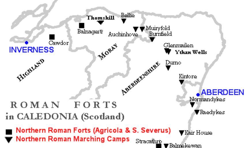 Keywords: RomanFortsNorthernScotland.gif en Map of Northern Caledonia Scotland showing Roman Forts and Marching Camps little forts during the Agricola Campaign first century and the Septimius Severus Campaign third century Map and data done with my own software Own Paul0559 2009-07 History of Scotland Ancient Roman forts in Scotland Maps of Roman Britain |