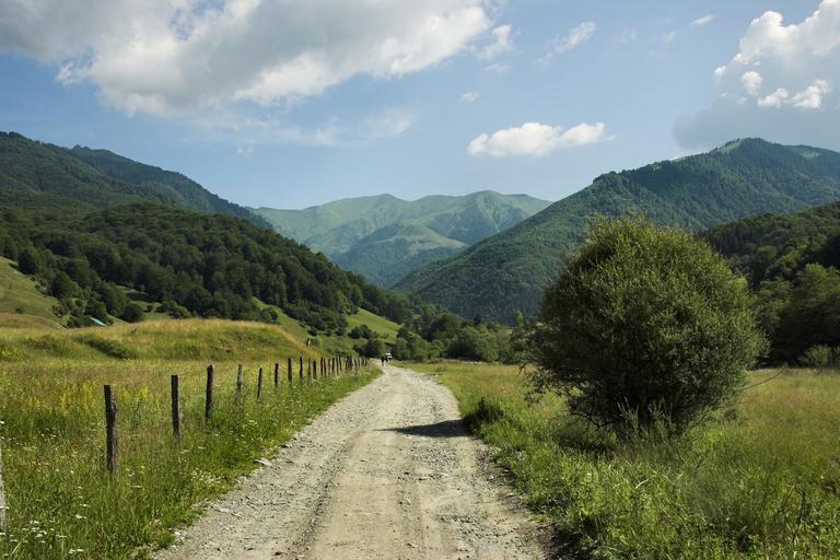 Keywords: romania landscape mountains forest woods trees nature outside outdoor fields meadows road fence sky clouds green beautiful tranquil