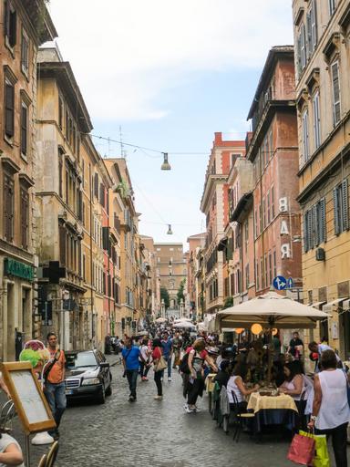 Keywords: rome italy city streets cobblestone people pedestrians restaurants eating buildings houses apartments architecture crowd