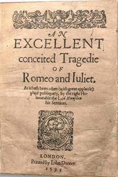 | Keywords: Romeo and Juliet Q1 Title Page.jpg  William Shakespeare's play Romeo and Juliet printed by John Danter in 1597 http //internetshakespeare uvic ca/Library/facsimile/ Internet Shakespeare Editions John Danter 1597 PD-old-100 Romeo and Juliet 1597 books Title pages from the United Kingdom |
