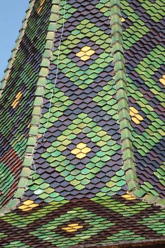 Keywords: roofing tiles steeple church building france alsace pattern green gold brown house of worship spire farbenspiel