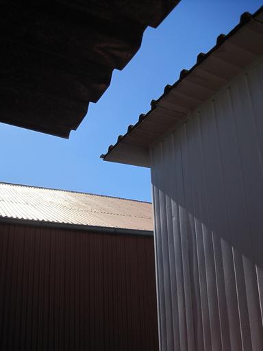 Keywords: rooftops underside rectangular dimensions corrugated sun and shade blue sky texture