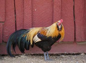 Keywords: rooster male bird poultry colorful chicken agriculture domestic farming beak feather barnyard livestock nature looking profile portrait barn