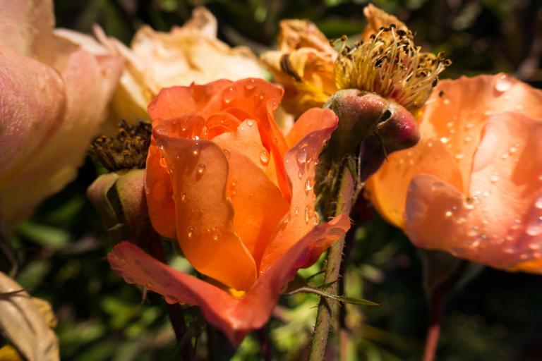 Keywords: rose bud open orange flower blossom bloom rose bloom beautiful plant nature bright rain beads wets faded without petals stamens