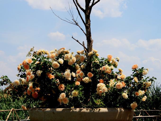 Keywords: rose bush flowers small pink pearly pot large dry tree sky