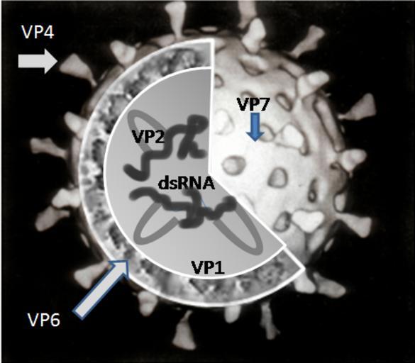 Keywords: Rotavirus Structure.png A simplified diagram of the location of rotavirus structural proteins Transfer from English Wikipedia 2008-02-29 GrahamColm en English Wikipedia GrahamColm Rotavirus