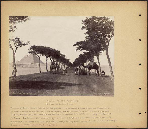 Keywords: Route to the Pyramids by Boston Public Library.jpg Scrapbook page with one photograph showing a tree-lined road leading to the pyramids in Egypt annotated with information about the pyramids Subjects Egypt travel photography landscapes environments pyramids tombs Jīzah Ahrāmāt al- Pyramids--Egypt--Al-Qāhirah Page size 33 x 38 1 cm Annotations The period of Pyramid building seems to have been from the IVth to XII Dynasty a period of about two thousand years The Pyramid seemed to have faded out in the XII dynasty and was succeeded by the rock tomb and the mortuary temple Only two Sakhara and Medum are supposed to be earlier than the great Pyramid of Cheops The Pyramid was never a family monument but belonged like other Egyptian tombs to one person the other members of a royal family having small pyramids near that of the king There are several near that of Cheops Language English photograph has French title Rights No known restrictions Coverage Egypt Notes Title supplied by cataloger derived from captions or annotated information Format Scrapbooks Technique Photographs Albumen prints BPL Department Print Department Photo 1 Photographer G Lékégian Cie Title Route des Pyramides No 3 Caption Route to the Pyramids Shaded by lebbek trees Date ca 1865- 1895 Flickr data on 2011-08-03 Camera Sinar AG Sinarback 54 FW Sinar m License CC BY 2 0 User Boston Public Library BPL Flickr http //flickr com/photos/24029425 N06/2468303649 Route to the Pyramids December 21 1892 March 8 1893 Flickr upload date 2008-05-01 17 10 18 William Vaughn Tupper Flickr uploader http //www flickr com/people/24029425 N06 BPL User Flickr upload bot/upload 14 44 3 August 2011 UTC Fæ CC BY 2 0 PD-old-100 Historical images of Giza 1890s Historical images of Great Pyramid 1890s Tupper Scrapbooks volume 26 Lower Egypt G Lekegian Photos uploaded from Flickr by Fæ using a script |