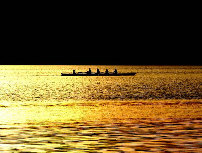 Keywords: rowing boat rowing quad gold water lake abendstimmung nature recovery rest sun light mood shadow silhouette