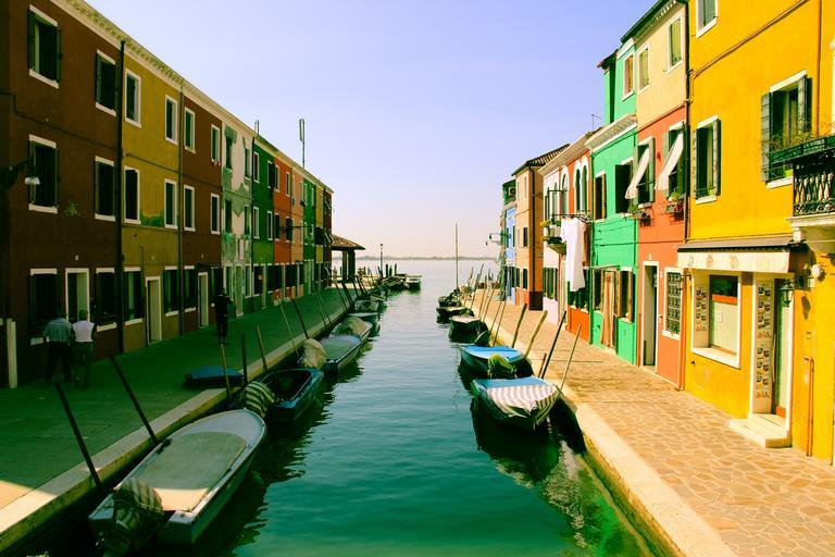 Keywords: rowing boats canal boats urban colorful facade houses grunge sky apartments buildings windows balconies balcony water sidewalk town pedestrians people walls sunny