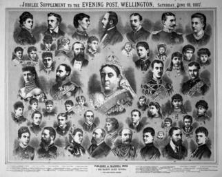 Keywords: blackandwhite monochrome photo border sport team sport collection black and white Shows head and shoulders portrait of fifty members of the Royal family, including Queen Victoria in the centre, and her late husband Prince Albert. Quantity: 1 colour art print(s). Physical Description: Tinted lithograph, on sheet 446 x 677 mm. Blundell Brothers Ltd. [The Royal family]. Jubilee supplement to the Evening Post, Wellington, Saturday June 18, 1887. Published by Blundell Bros.. Ref: Eph-D-ROYAL-1887-01. Alexander Turnbull Library, Wellington, New Zealand. natlib.govt.nz/records/22895715 Shows head and shoulders portrait of fifty members of the Royal family, including Queen Victoria in the centre, and her late husband Prince Albert. Quantity: 1 colour art print(s). Physical Description: Tinted lithograph, on sheet 446 x 677 mm. Blundell Brothers Ltd. [The Royal family]. Jubilee supplement to the Evening Post, Wellington, Saturday June 18, 1887. Published by Blundell Bros.. Ref: Eph-D-ROYAL-1887-01. Alexander Turnbull Library, Wellington, New Zealand. natlib.govt.nz/records/22895715 |