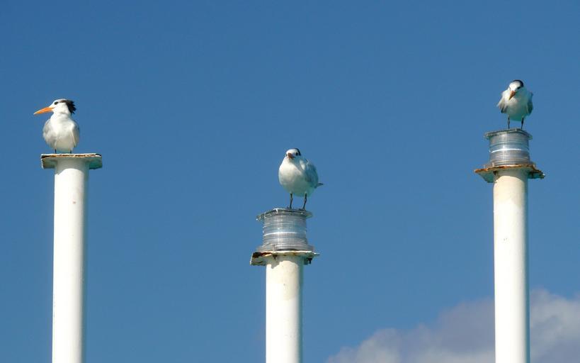 | Keywords: Royal Tern Trio-27527.jpg A trio of Royal Terns Sterna maxima perched atop the flagpoles at the end of the pier at the http //www elcozumeleno com El CozumeleƱo Resort <br>Photo taken with a Panasonic Lumix DMC-FZ50 on the island of Cozumel in Quintana Roo Mexico http //www kenthomas us KenThomas us<br> personal website of photographer 2008-02-02 15 17-06 <sup>ISO 8601</sup> Ken Thomas This image is released to the public domain and therefore no permission or credit is required <br>Comments and/or feedback however are always welcome See my user page for contact info Thalasseus maximus Three birds Taken with Panasonic Lumix DMC-FZ50 |