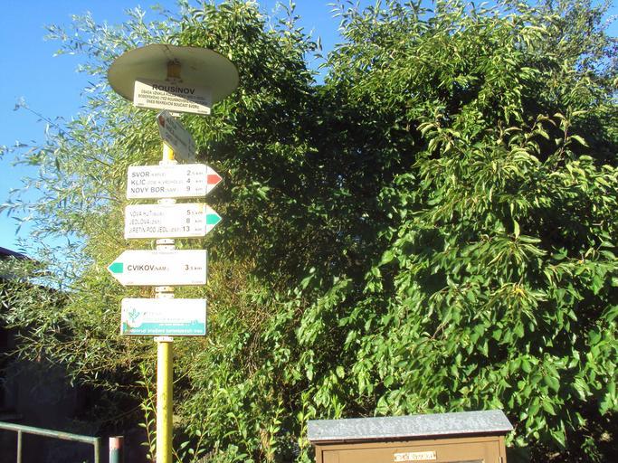 Keywords: Rozcestník Rousínov.JPG cs Rozcestník v Rousínově pod Milštejnem own Zákupák 2013-08-12 Rousínov Svor Hiking and footpath fingerposts in Česká Lípa District