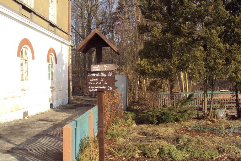 Keywords: Rozcestník u stanice Z.jpg cs Rozcestník vedle budovy železniční stanice Zahrádky own Zákupák 2011-03-13 Hiking and footpath fingerposts in Zahrádky Zahrádky u České Lípy train station