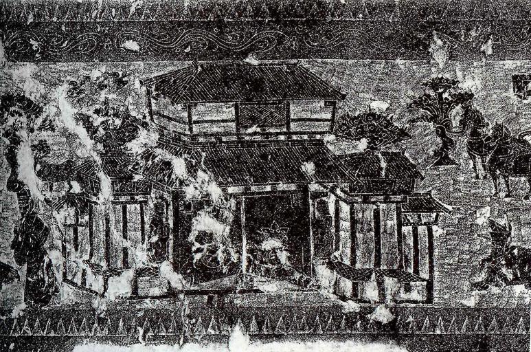 Keywords: Rubbing of a Han Citang.JPG A rubbing of a Chinese Han Dynasty 202 BC 220 AD pictorial stone i e the Yinan stone carving of Shandong province China showing an ancestral worship hall citang 祠堂 with closed doors a person outside making a sacrificial offering to his ancestors and horses and trees in the background Photo scanned from Constructing Citang in Han in Rethinking Recarving China's Past New Haven and London Yale University Press and Princeton University Art Museum 2008 by Michael Nylan edited by Naomi Noble Richard 202 BC to 220 AD author PD-art Reliefs of the Han Dynasty Stone rubbings |