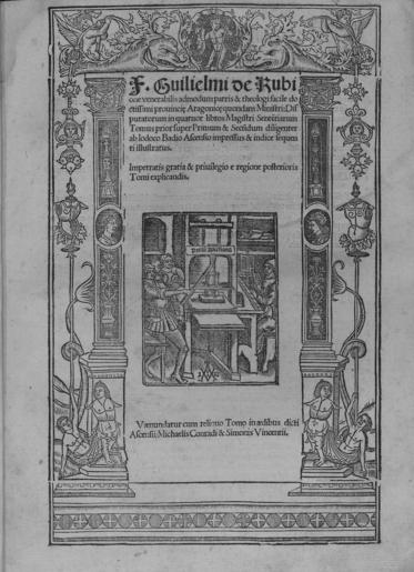 | Keywords: Rubio - Disputata in quatuor libros Magistri Sententiarum, s. d. - 4424183.tif Book Rubio Guillen Disputata in quatuor libros Magistri Sententiarum vaenundantur in aedibus dicti Ascensii Michaelis Conradi Simonis Vincentii Parigi lat it 1 F Guilielmi de Rubione Disputatorum in quatuor libros Magistri Sententiarum tomus prior super primum secundum Diligenter ab Iodoco Badio Ascensio impressus indice sequenti illustratus - Parigi vaenundantur in aedibus dicti Ascensii Michaelis Conradi Simonis Vincentii s d Parigi impressorum Ab Iodoco Badio impensis eiusdem Simonis Vincentii ac Michaelis Conradi ad pascha 1518 - 8 CCCXCIII 1 c ; 2° - A cura di Alfonso de Villasanta il cui nome figura nella pref - Segn pigreco8 a10 b-z8 A-Z8 8 con8 rum8 BEIC 4424183 Institution BEIC PD-old-100-1923 Religious texts Josse Bade |