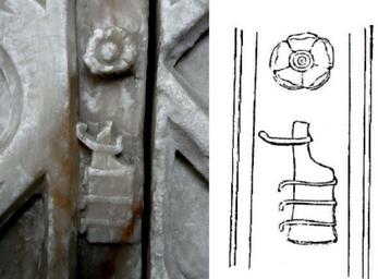 | Keywords: RudderHeraldicBadge MonumentTo RobertWilloughby 1stBaronWilloughbyDeBroke Died1502 CallingtonChurch Cornwall.png Rogers 1877 Rogers William Henry Hamilton The Antient Sepulchral Effigies and Monumental and Memorial Sculpture of Devon Exeter 1877 pp 346-7 Robert Willoughby 1st Baron Willoughby de Broke died 1502 was created the first Baron Willoughby de Broke <ref>W H Hamilton Rogers The Strife of the Roses Days of the Tudors in the West Exeter 1890 pp 1-10</ref> He rebuilt Brook Hall in the parish of Westbury Wiltshire and installed many heraldic stained glass windows which were recorded and described in 1650 by John Aubrey on his visit to Brook A common image in these windows was the heraldic badge of a rudder which was noted earlier by John Leland 1503-1552 when he visited Brook Sir Ralph Cheney's heraldic badge was a rudder as is visible sculpted on his monument in Edington Priory Church but had apparently first been adopted by his ancestors the Paveley family of Brook Aubrey stated concerning his visit to Brook Hall Mr Wadman would persuade me that this rudder belonged to the Paveleys who had this place here <ref>Aubrey John The Topographical Collections of John Aubrey AD 1659-70 with Illustrations Corrected and Enlarged by John Edward Jackson published by Wiltshire Archaeolocical and Natural History Society Devizes 1862 pp 399-402 Brook House p 400https //archive org/stream/wiltshiretopogra00aubr page/398/mode/2up</ref> Use of the Rudder badge descended to Cheney and then to Willoughby William Camden stated of Cheney's descendant Lord Willoughby by report Admiral used the helme of a ship for the seal to his ring A small rudder is sculpted on the alabaster monument and effigy of Robert Willoughby 1st Baron Willoughby de Broke died 1502 in Callington Church in Cornwall <ref>Rogers William Henry Hamilton The Antient Sepulchral Effigies and Monumental and Memorial Sculpture of Devon Exeter 1877 pp 346-7</ref> Two relief sculptures of rudders survive today in Edington Church and Aubrey noted in a chapel south of the chancel in Westbury Church in one window some rudders of ships or <ref>Aubrey ed Jackson pp 403-4</ref> They were also formerly visible in the church of Seend <ref>Aubrey ed Jackson editor's note p 400 footnote 1</ref> Two Rudder heraldic badges survive sculpted on the chantry chapel monument in Edington Priory Church Wiltshire to Sir Ralph Cheyne c 1337-1400 alias Cheney of Brooke in the parish of Westbury in Wiltshire thrice a Member of Parliament for Wiltshire and Deputy Justiciar of Ireland in 1373 and Lord Chancellor of Ireland 1383-4 He was Deputy Warden of the Cinque Ports Cheney's heraldic badge was a rudder apparently first adopted by his ancestors the Paveley family of Brook John Aubrey stated concerning his visit to Brook Hall Mr Wadman would persuade me that this rudder belonged to the Paveleys who had this place here <ref>Aubrey John The Topographical Collections of John Aubrey AD 1659-70 with Illustrations Corrected and Enlarged by John Edward Jackson published by Wiltshire Archaeolocical and Natural History Society Devizes 1862 pp 399-402 Brook House p 400https //archive org/stream/wiltshiretopogra00aubr page/398/mode/2up</ref> Use of the Rudder badge descended to Cheney and then to Robert Willoughby 1st Baron Willoughby de Broke Camden stated of Cheney's descendant Lord Willoughby by report Admiral used the helme of a ship for the seal to his ring Aubrey asserted that it had been used by Lord Willoughby de Broke in the reign of King Edward IIIs However there was no such baron until Hen VII and no Willoughby Admiral appears in Rapin's List <ref>Aubrey ed Jackson editor's note p 400 footnote 1https //archive org/stream/wiltshiretopogra00aubr/wiltshiretopogra00aubr_djvu txt</ref> The device of a Rudder in stained glass windows was recorded by John Leland 1503-1552 when he visited Brook It survives today in Edington Church and Aubrey noted the presence in a chapel south of the chancel in Westbury Church in one window some rudders of ships or <ref>Aubrey ed Jackson pp 403-4</ref> Also present in church of Seend <ref>Aubrey ed Jackson editor's note p 400 footnote 1</ref> own photo and drawing in Rogers William Henry Hamilton The Antient Sepulchral Effigies and Monumental and Memorial Sculpture of Devon Exeter 1877 pp 346-7 1877 unknown; 2016 Lobsterthermidor <span class signature-talk ></span> 12 26 10 April 2016 UTC 1877/2011 PD-old-100 Paveley rudder St Mary's Church Callington Cornwall |