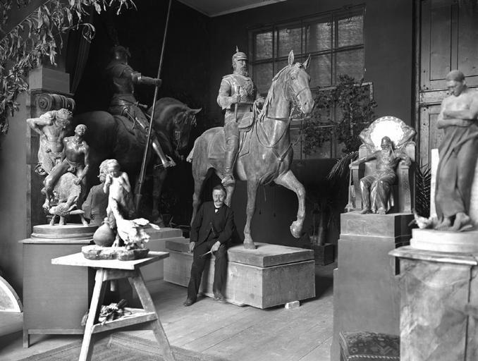 | Keywords: Rudolf Maison in seinem Atelier.jpg Rudolf Maison in seinem Atelier in München-Gern Tizianstraße 16 von links nach rechts 1 Karyatide/Atlas 2 Neger auf einem Esel reitend 1893 3 Büste von 4 Knabe mit Gans 5 dahinter Ein reitender Landsknecht für Bremen 1903 1942 eingeschmolzen 6 Reiterstandbild Friedrich III Deutscher Kaiser für das Kaiser-Friedrich-Museum nach 1945 eingeschmolzen 7 Wotan auf dem Rabenthron große Fassung für Hermann Hendrichs Sagenhalle in Schreiberhau Verbleib 8 http //www nibelungen-hort de/50857696480d8e102/index html ca 1900 Der Münchner Hoffotograf Carl Teufel 1845-1912 http //www fotomarburg de/bestaende/uebernahm/filser Rudolf Maison Carl Teufel Sculptors' studios Pickelhaube PD-old Equestrian statues in Germany 1900 in Munich Tizianstraße Munich Black and white photographs of ateliers |