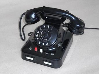 Keywords: RueckfrageApparat W51-01.jpg Rückfrageapparat W51 ca 1959 German telephone W51 about 1959 Own 2011-09-05 Hubert Berberich HubiB public domain Rotary dial telephones Black telephones