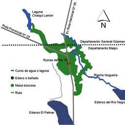 Keywords: Ruinas del km 75 map.png en A map showing area of Ruinas del km 75 Chaco province Argentina which correspond to Concepción del Bermejo city Concepción del Bermejo existed between 1585 and 1632 Legends in English from up to down stream or lagoon; marsh; forest; road es Mapa del área circundante de las Ruinas del kilómetro 75 departamento Maipú provincia del Chaco Argentina que corresponde a la extinta ciudad de Concepción del Bermejo 1585-1632 Own creation based on a map published by Eldo Morresi in 1971 2007-10-11 User Pertile in es wikipedia Public domain Concepción del Bermejo Maps of Chaco |