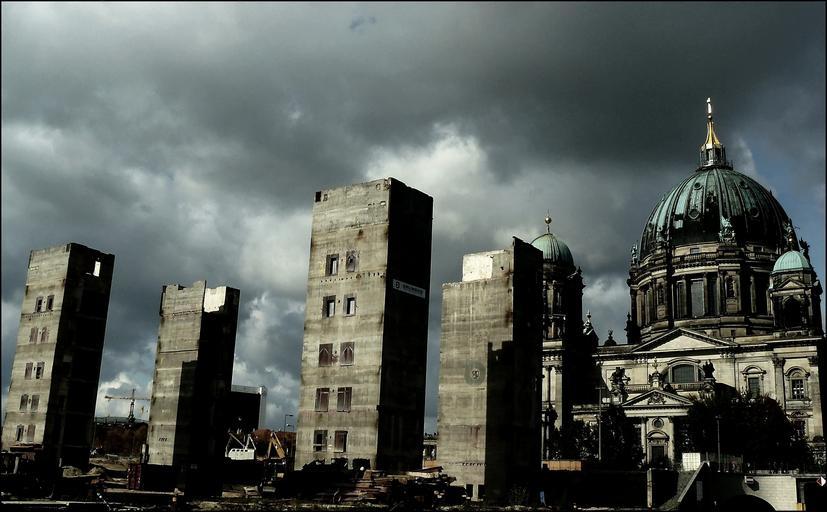 | Keywords: ruins ruin palace of the republic berlin berlin cathedral old building architecture dom church back light sun thunderstorm clouds gloomy sky lighting pages light mystical mood atmosphere contrast contrasts bauruine dome demolition towers tower historically 2008 spree island history |