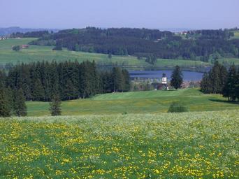 Keywords: ruins steeple rottachsee elleghoehe forest meadow flower meadow panorama allgäu outlook view sky nature wide landscape water grass horizon reported distant blue