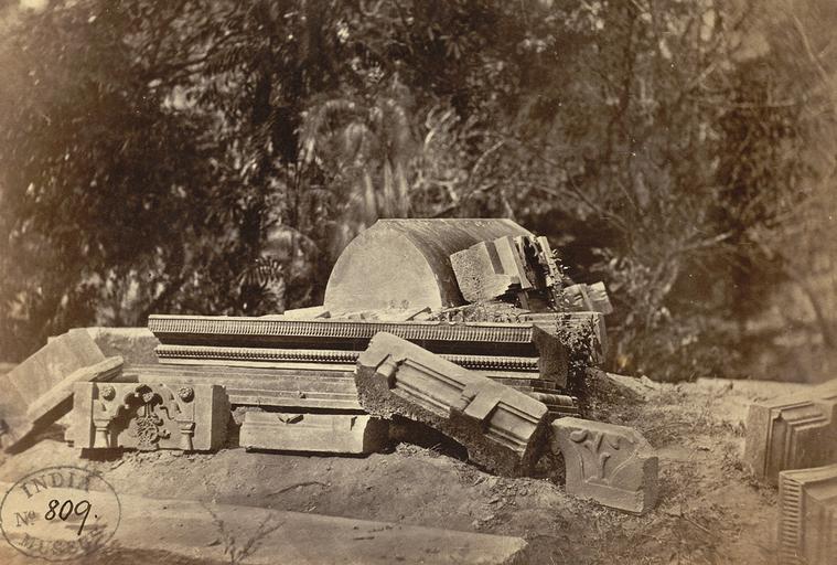 | Keywords: Ruins of the Tomb of Ghias-ud-din Azam Shah, Sonargaon 1872.jpg en Photograph of ruins from the Tomb of Ghiyas-ud-din Azam Shah Sonargaon near Dhaka in Bangladesh from the Archaeological Survey of India Collections taken by W Brennand in 1872 The province of Dhaka was brought under Islamic rule in the 13th century first by the Delhi Sultanate then by the independent sultans of Bengal after which it was taken by the Mughals in 1608 Sonargaon was the capital of sultans of Bengal from the 13th century until 1608 when Islam Khan the Mughal Governor transferred the capital of the whole province to the nearby city of Dhaka now the capital of Bangladesh Ghiyas-ud-din Azam Shah ruled Bengal from 1368 to 1373 His mausoleum at Sonargaon was carved from a single black of hard black basalt and surrounded by a pillared enclosure The tomb is described in J Wise Notes on Sunargaon Eastern Bengal Journal of the Asiatic Society of Bengal vol XLIII part I Calcutta 1874 pl VIII 'This tomb has fallen to pieces The iron clamps that bound the slabs together have rusted and the roots of trees have undermined the massive stones This mausoleum formerly consisted of a ponderous stone which occupied the centre surrounded by pillars about five feet in height The stones are all beautifully carved and the corners of the slabs and the arabesque tracery are as perfect as the day they left the workman's hands The stones are formed of hard almost black basalt This tomb might be easily repaired and the cost of doing so would be inconsiderable There is no old building in Eastern Bengal which gives a better idea of Muhammadan taste than this ruined sepulchre; and there is none when properly repaired which would so long defy the ravages of time ' 1872 http //www bl uk/onlinegallery/onlineex/apac/photocoll/r/019pho001000s27u02730000 html Brennand W Custom license marker 2013 01 06 PD-Bangladesh Uploaded with UploadWizard Brennand W Old vintage photographs of Bangladesh |
