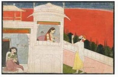 Keywords: Rukminimessenger.jpg Rukmini and the messenger 1775-1785 V A Museum no IS 129-1951 Techniques - Opaque watercolour on paper Place - Tehri Garhwal India Dimensions - Height 16 6 cm with border Width 24 8 cm with border The painting shows an episode from the story of Krishna and Rukmini known as the 'Rukmini-Harana' or 'Abduction of Rukmini' This scene shows Rukmini in a pavilion listening to a messenger sent by her lover the Hindu god Krishna The messenger shown with his hand raised to indicate that he is speaking brings Rukmini the welcome news that Krishna intends to abduct her in order to prevent her marriage to another man The bright red background accentuates the passionate feelings that Rukmini has for the absent Krishna http //collections vam ac uk/item/O121232/painting-rukmini-and-the-messenger/ 1775 1785 author PD-art-100 Paintings in the Victoria and Albert Museum Rukmini 18th-century watercolor paintings from India Art of India in the Victoria and Albert Museum |
