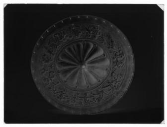 Keywords: Rundsköld - Livrustkammaren - 77058-negative.tif LSH artwork sv Rund sköld med dekor i tre fält Ytterst en slät kantbård i ytterkanten 36 fyrsidiga taggar med spår av förgyllning Därinnanför en ring kantad med lagerkransbårder spår av förgyllning på ringen i hög relief ett nereid-och tritontåg mot punsad bakgrund spår av förgyllning I mitten en krysantemumblomma med 12 större blad med rester av förgyllning och däremellan smalare blanka blad I mitten en uppdriven spets däri inskruvat en 142 mm hög balusterformig fyrsidig spets med fasade kanter rester av förgyllning Ett hål på vardera sidan om spetsen <br/><br/>På baksidan ett kraftigt stålhandtag l 150 mm på motsatta sidan fastnitat en läderrem l 330 mm med ett hål samt en sölja av stål fastnitad i ett dubbelt stålband b 30 mm som i sin tur är nitat i skölden <br/><br/>Krigsbyte från Warszawa 1655-08-30 I LRK äldre inventarier upptagen som en del av Magnus Ladulås rustning utställd i kungalängden i Riddarholmskyrkan 1823-1855 original caption rundsköld - LRK 2935 Erövringen av Warszawa ca 1550 steel - leather g 4730 size mm 565 LRK Magnus Ladulås av Sverige kung Wawel 1000-2000 2000 Eagle and Three Crowns 2002 Eagle and Three Crowns 2002 Sweden and Europe 1632-1792 2003-2004 Örnen och de tre kronorna 2003 Parures Triomphales 2003 Krigsbyte 2007-2008 Imagines potestatis - Regalia and Symbols of Authority of Polish Kings and Grand Masters of the Teutonic Knights 2007 Europa Jagellonica 1386-1572 - Kunst und Kultur Mitteleuropas zur Zeit der Jagiellonen 2012-2013 Kutná Hora Warszawa Potsdam place of origin original filename LN_A00139_000139 39545 inventory number LRK 2935 77058 CC0 Rundsköld - Livrustkammaren - 77058 tif <gallery caption Different images of same object > File Detalj dekor Rundsköld Polen ca 1550 efter italiensk förebild - Livrustkammaren - 50181 tif File Rundsköld - Livrustkammaren - 25699 tif File Detalj dekor Rundsköld Polen ca 1550 efter italiensk förebild - Livrustkammaren - 67304 tif File Detalj dekor Rundsköld Polen ca 1550 efter italiensk förebild - Livrustkammaren - 58742 tif </gallery> Shield images from Livrustkammaren |
