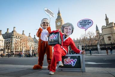 Keywords: rupert murdoch rupertmurdoch theresa may theresamay sky parliament takeover big ben bigben politics media freedom transparency avaaz fox leveson inquiry ofcom regulation regulator fit and proper fitandproper outdoor London, UK. 20/12/16. Protesters from the global civic movement Avaaz, dressed as Rupert Murdoch and Theresa May, demonstrate in Parliament Square to call on the British government to launch a full investigation into Rupert Murdoch before he can proceed with his planned takeover of Sky. Photo credit: Rob Pinney/Avaaz London, UK. 20/12/16. Protesters from the global civic movement Avaaz, dressed as Rupert Murdoch and Theresa May, demonstrate in Parliament Square to call on the British government to launch a full investigation into Rupert Murdoch before he can proceed with his planned takeover of Sky. Photo credit: Rob Pinney/Avaaz |