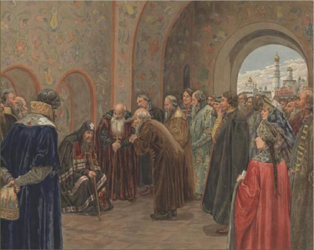 | Keywords: Rupture of patriarch Nikon with tsar Aleksey Mihajlovich.jpeg  Rupture of patriarch Nikon with tsar Aleksey Mihajlovich Раз ыв пат иа ха  икона с ца ем Алексем  ихайловичем http //chron eduhmao ru/img_7_12_0_2 html end of XIX c Sergey Miloradovich 1851  1943 PD-Russia-2008 Patriarch Nikon in history paintings Sergey Miloradovich |