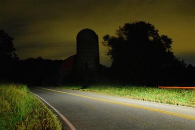 Keywords: rural night silo silhouette farm outdoors remote illuminated light bright tranquil green agricultural