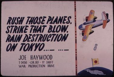 | Keywords: Rush those planes. Strike that blow. Rain destruction on Tokyo. - NARA - 534740.jpg  Scope and content General notes 534740 Local identifier 179-WP-889 Office for Emergency Management War Production Board 01/1942 - 11/03/1945 Still Picture Records Section Special Media Archives Services Division NWCS-S National Archives at College Park 8601 Adelphi Road College Park MD 20740-6001 other date circa 1942 1943 Record group Record Group 179 Records of the War Production Board 1918 - 1947 Record group ARC 508 War Production Board compiled 1942 - 1943 Series ARC 533858 File unit File unit ARC Variant control numbers NAIL Control Number NWDNS-179-WP-889 Other versions <gallery> File Rush_those_planes _Strike_that_blow _Rain_destruction_on_Tokyo _-_NARA_-_534740 tif tif File Rush_those_planes _Strike_that_blow _Rain_destruction_on_Tokyo _-_NARA_-_534740 jpg jpg </gallery> NARA-cooperation PD-USGov World War II posters from the United States |