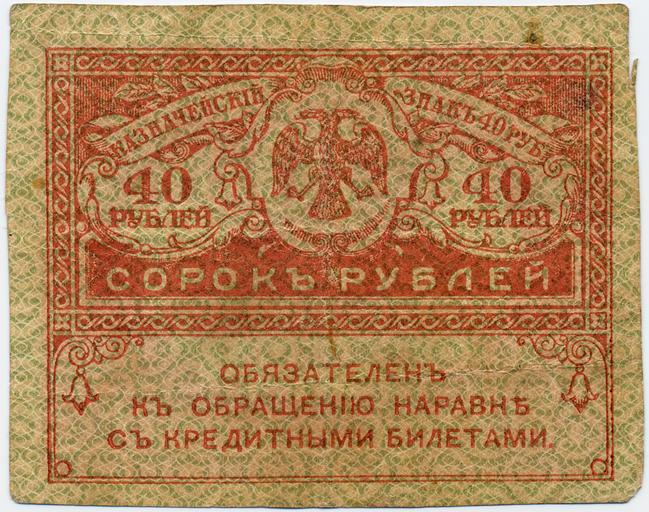 | Keywords: Russia-1917-Banknote-40-Obverse.png Provisional Government of Russia banknote 1917 40 rubles obverse Казначейский знак В еменного п авительства России 1917 год 40 ублей лицевая сто она own <br /> Banknote is courtesy of collector who wants to remain anonymous Thank you Банкнота п едоставлена коллекционе ом пожелавшим остаться анонимным Спасибо 1917 Provisional Government of Russia PD-RusEmpire PD-old currency Banknotes of Russia 1917 Banknotes with a face value of 40 | ||||