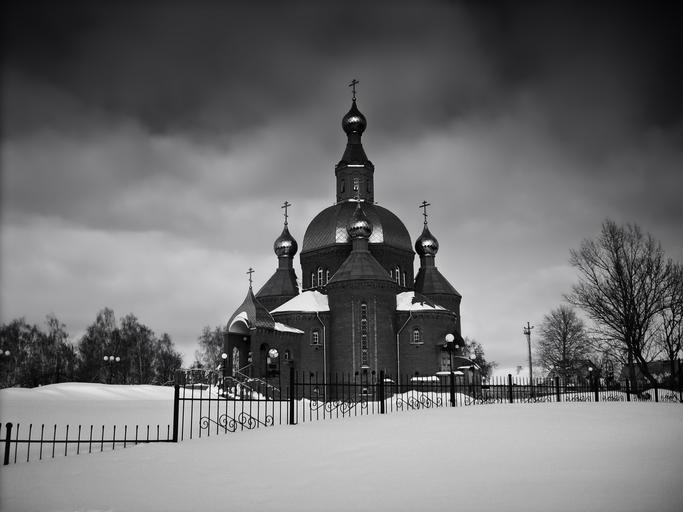 Keywords: russia church orthodox black and white sky clouds building architecture winter snow nature outside trees silhouettes fence dome countryside landscape scenic