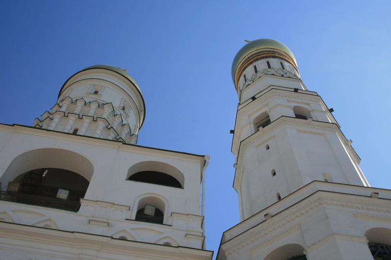 Keywords: russian architecture white buildings reflecting light curved window openings golden onion domes clock tower tall towers assumption belfry left bell tower blue sky