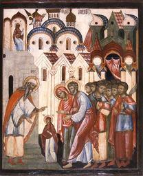 | Keywords: Russian - Presentation of the Virgin in the Temple - Walters 372410.jpg This scene is rarely met with as a separate icon although it occurs as one of the subjects on smaller ones The subject is one of the church's Twelve Festivals which were represented on the third tier of the iconostasis alter screen and icon stand combined which divided the sanctuary from the nave It depicts the Virgin's presentation in the Temple In accordance with traditional iconography used for representing this holy fest the Virgin the smaller figure in the foreground is being presented by her parents Joachim and Anna to the priest Zacharias who holds out hands to bless her The seven taper-bearing daughters of Zion daughters of Israel friends of the Virgin stand behind Joachim and Anna The large dimensions of this panel demonstrate the great size to which an iconostasis could attain century 18 Early Modern tempera panel cm 129 5 106 1 accession number 37 2410 30743 Russian Government export permit July 23 1962 Llewellyn E Thompson Baltimore 1962 by purchase Walters Art Museum Gift of The Honorable Llewellyn E Thompson 1964 Realms of Faith Medieval and Byzantine Art from the Walters Art Museum Frist Center for the Visual Arts Nashville 2001-2002 Realms of Faith Medieval and Byzantine Art from the Walters Art Museum Frist Center for the Visual Arts Nashville 2002-2005 place of origin Russia Walters Art Museum license 2D Russian art in the Walters Art Museum Religious art in Russia Art of the Russian Orthodox Church Russian icons in the Walters Art Museum Media contributed by the Walters Art Museum needs category review |