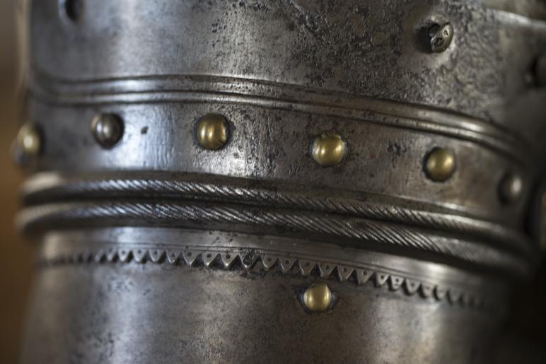 | Keywords: Rustning och nitar, 1500-talets slut - Skoklosters slott - 100606.tif LSH artwork sv Helrustning ej komplett Alla delar stämplade med Augustburgs pinjekotet och sax Enligt 1930 års katalogkort även med initialerna C S har ej kunnat upptäckas nu 1500-talets slut <br/>Bestående av 19760819 <br/>Bröstharnesk 14855 1<br/>Ryggharnesk 14855 2<br/>Ringkrage 14855 3<br/>ländskört 14855 4<br/>h axelstycke med armskydd 14855 5<br/>h handske 14855 6<br/>v axelstycke med armskydd 14855 7<br/>h lårskena med knäbuckla 14855 8<br/>v lårskena med knäbuckla 14855 9<br/>hjälm 14855 10<br/>v handske 14855 11<br/>14855 1 Bröstharnesk Låg rundad snedräfflad halshanr Dubbla graverade linjer kring hals armar och nedre kant Svagt markerad mittås Två mässingsnitar i nederkanten - för att fösta tassetterna vilka nu saknas Har troligen haft dekor av mässingsnitar utmed nederkanten Spår finnes Fastnitade läderremmar vid axlarna - att spännas vid ryggstycket <br/>H 380 mm bröstvidd 500 mm <br/>14855 2 Ryggharnesk Låg rundad snedräfflad halskant Graverade linjer på motsvarande sätt som bröstharneskets axelstycken I midjans högra sida fastnitad vit sämskad rem - spår av läderrem i vänster sida finnes <br/>H 365 mm ryggvidd 530 mm <br/>14855 3 Ringkrage med halskrage bestående av tre lameller upptill avslutad med snedräfflad kant Mässingsnitar Fodrad med vitt matlareat tyg kantat med röd sammet <br/>14855 4 Ländskört Bestående av fem lameller med mässingsnitar Påhakat vid ryggharnesket på högra sidan spärrat med hake <br/>H 180 mm b 870 mm <br/>Tillbehör Stativ nr 14866<br/>14855 5-7 11 Axelstycken med armskydd och till hörande handskar Axelstycket består av fem lameller - ryggbladen stora De sidor som går in över överarmsskyddet har tandad kant Främre nedre lamellen med mässingsros saknas på 14855 7 Axelskydd med mässingsfodrat spänne i vilket rem från ringkragen spännes Armbucklan med snidad lotusblomma Handske nr 14855 6 är komplett med stelt handledsskydd och hand-och fingerskydd T o m främre knogen bestående av lameller 14855 11 saknar de sex främre lamellerna med knogskydd 14855 11 har röd sammetskantad överkant - saknas på 14855 6 <br/>L armskydd 770 mm diam 470 mm l handske 67 mm fel mått diam 97 fel mått mm<br/>14855 8-9 Lårskenor med knäbucklor Lårskenan i två delar Den övre bestående av 4 lameller - den undre av en hel skena med knäbuckla av 8 lameller nr 14855 8 saknar nedersta delen Skarven mellan de båda delarna ornerade med räffelgraverad rund kant Dekor av graverade linjer och mässingsnitar <br/>L 520 mm b 360 mm <br/>14855 10 Hjälm visir hjälm låg mjuk rundad kant Utan hjälmkrage nertill avslutad med liten kant räffelgraverad Högra sidan med stödstång för visiret Invändigt korsade hjässremmar av sämskat skinn <br/>H 300 mm original caption Rustning och nitar 1500-talets slut <br/> Nyckelord 1500-tal Nitar Stål Dekor Rustning end other date century 16 size mm 1040 SKO C S place of origin original filename sm_dig15700 35687 inventory number SKO 14855 100606 CC-BY-SA Miguel Herranz <gallery caption Different images of same object > File Rustning 1500-talets slut - Skoklosters slott - 100602 tif File Rustningshandske 1500-talets slut - Skoklosters slott - 100608 tif File Armskydd till rustning 1500-talets slut - Skoklosters slott - 100607 tif File Rustning och nitar 1500-talets slut - Skoklosters slott - 100605 tif File Hjälmvisir 1500-talets slut - Skoklosters slott - 100603 tif File Rustning och nitar 1500-talets slut - Skoklosters slott - 100609 tif File Hjälmvisir 1500-talets slut - Skoklosters slott - 100604 tif </gallery> Steel Decoration Armour 16th century Rivets Miguel Herranz Media contributed by LSH 2015-11 Arms and armour in the Skokloster Castle |