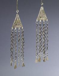 | Keywords: S S Habshush - Pair of Triangular Pendants from a Woman's Headpiece - Walters 572312A, 572312B.jpg These ornaments were part of a woman's headpiece The triangular pieces are cast and have one top and four bottom loops which are soldered on The front design consists of three small circles on the right and left side; a bead-molded separation line and similar borders frame the motif The small flat dangles at the lower end of the chains represent small hands On the back of one pendant is a stamp in Arabic with the name of the ruler and the date al-Mansur 1215 Al-Mansur Ali I ruled from AH 1189 to 1224 AD 1775-1809 ; he was the son of Al-Mahdi al- Abbas and belonged to the Qasimid family On the back of the other pendant is an engraving in Hebrew with the name of the Jewish silversmith S alim S alim Habshush 1215 AH/AD 1800-1801 silver Triangle H without loops 1 7/16 x W of base 1 1/8 in 3 6 x 2 8 cm accession number 57 2312A 57 2312B 81487 Mr Benjamin Zucker Zucker Family Trust and Mr Derek Content New York and London by purchase Walters Art Museum Gift of Mr Benjamin Zucker and Mr Derek Content in honor of Mrs Barbara Zucker and Mrs Amanda Content 2010 Stamp Arabic al-Mansur 1215 AH Engraving Hebrew S alim S alim Habshush place of origin northern Yemen Walters Art Museum license Earrings Jewellery in the Walters Art Museum South Arabian art in the Walters Art Museum S S Habshush 1210s works 1800s works Media contributed by the Walters Art Museum needs category review |