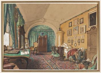 | Keywords: S. Tolstoi - Interior of a Man's Living Room - Google Art Project.jpg 1850 1899 S 6837540 Tolstoi 1850 - 1899 /collection/cooper-hewitt-national-design-museum/artwork/interior-of-a-mans-living-room-s-tolstoi/6850396/ 229955 S Tolstoi /collection/cooper-hewitt-national-design-museum/ Cooper-Hewitt National Design Museum 3644669 http //www cooperhewitt org/ 3/12/2012 5 38 08 PM /collection/cooper-hewitt-national-design-museum/artwork/interior-of-a-mans-living-room-s-tolstoi/6850396/ 1853 1853 Brush and watercolor on heavy wove paper Eugene V Thaw Collection; Shepherd Gallery New York 6850396 False 1853 3/25/2012 2 03 18 PM 2007-27-55 http //collection cooperhewitt org/view/objects/asitem/id/229955 Thaw Collection Drawing 1850 1860 1853 False 1 3800539083558 Object interior-of-a-mans-living-room-s-tolstoi Interior of a Man's Living Room i Gail S Davidson et al House Proud Nineteenth-Century Watercolor Interiors from the Thaw Collection New York Cooper-Hewitt National Design Museum Smithsonian Institution 2008 120 pl 55 Frame H x W x D 39 7 x 50 2 x 2 5 cm 15 5/8 x 19 3/4 x 1 in Sheet 24 9 x 35 3 cm 9 13/16 x 13 7/8 in Brush and watercolor on heavy wove paper Heavy wove paper Eugene V Thaw Collection; Shepherd Gallery New York Lower right in Cyrillic characters in ochre watercolor and faintly dated S Tolstoi 1853 special url_id MAHFTMKVznQPWA PD-old-100-1923 1899 Google Art Project works by S Tolstoi Watercolors of building interiors in the Cooper “Hewitt Smithsonian Design Museum Google Art Project works in Cooper-Hewitt Smithsonian Design Museum 1850s interiors in art 1850s drawings House of Tolstoy Living rooms in art Paintings of interiors of Russia |