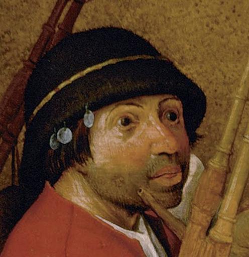 Keywords: Sackpfeifer in Bruegels Bauernhochzeit.jpg Detail aus Pieter Bruegels Gemälde Die Bauernhochzeit Das Gesicht eines der Sackpfeifer Pieter Bruegel the Elder - Peasant Wedding - Google Art Project 2 jpg ~ 1568 creator Pieter Bruegel the Elder PD-art-100 Details of The Peasant Wedding Bagpipers in art Men with hats in art |