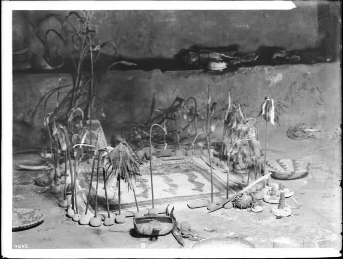 | Keywords: Sacred altar made of corn meal in the antelope kiva for the Hopi Snake Dance Ceremony at Walpi, Arizona, ca.1897 (CHS-4643).jpg en <br> Sacred altar made of corn meal in the antelope kiva for the Hopi Snake Dance Ceremony at Walpi Arizona ca 1897 Photograph of a sacred altar made of corn meal in the antelope kiva for the Hopi Snake Dance Ceremony at Walpi Arizona ca 1897 The altar an intricate painting in multicolored corn meal is surrounded by numerous long slender curved sticks stuck in small round dried mud pedestals Several small bowls and baskets sit on the surrounding dirt floor Several other objects lay on a ledge in shadow in the background Call number CHS-4643 Legacy record ID chs-m16968; USC-1-1-1-13888 Photographer James George Wharton Filename CHS-4643 Coverage date circa 1897 Part of collection California Historical Society Collection 1860-1960 Type images Geographic subject city or populated place Walpi Repository name USC Libraries Special Collections Accession number 4643 Microfiche number 1-170- Archival file chs_Volume97/CHS-4643 tiff Part of subcollection Title Insurance and Trust and C C Pierce Photography Collection 1860-1960 Repository address Doheny Memorial Library Los Angeles CA 90089-0189 Geographic subject country USA Format aacr2 4 photographss glass photonegative transparency photoprints b w ; 17 x 22 cm 20 x 25 cm 21 x 26 cm Rights Digitally reproduced by the USC Digital Library; From the California Historical Society Collection at the University of Southern California Subject adlf tribal areas Project USC Repository email specol usc edu Identifying number unidentified no James-303 Contributing entity California Historical Society Date created circa 1897 Publisher of the digital version University of Southern California Libraries Format aat transparencies; photographic prints; photographs Geographic subject state Arizona Subject file heading Indians -- Hopi -- Snake Dance Geographic coordinates -110 397217 35 832218 Format glass plate negatives Access conditions Send requests to address or e-mail given Phone 213 821-2366; fax 213 740-2343 Geographic subject county Navajo Subject lcsh Indians of North America; Hopi Indians; Rites and ceremonies; Men Subject Hopi Indians; Hopi Snake Dance Ceremony circa 1897 date created George Wharton James 1858 1923 http //digitallibrary usc edu/cdm/ref/collection/p15799coll65/id/16887 PD-old-70-1923 Images from USC Digital Library uploaded by Fæ Photographs by George Wharton James California Historical Society Collection 1860-1960 Glass plate negatives Hopi |